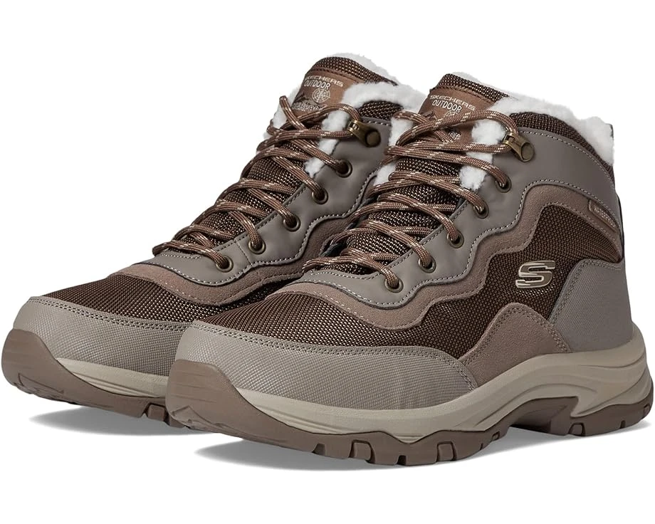 A perfect blend of toasty comfort and rugged style, the SKECHERS® Trego – Mountain Scenery boots will keep you at ease throughout your hiking trail. SKU: #9788594Heavy mesh and synthetic upper with suede overlaysSherpa lining offers enhanced insulation. Air Cooled Memory Foam® insole cushions during foot impact.EVA midsole. Relaxed Fit® design provides a roomy, comfortable fit.Waterproof construction. Lace-up closure ensures a customized fit. Round toe silhouette. Signature logo detail on the quarter. Low heel design. All-terrain rubber traction outsole.Imported. Measurements: